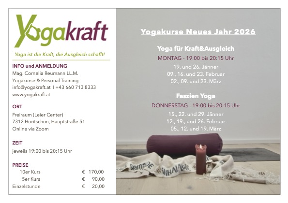 Bitte Yogamatte, Decke, bequeme Kleidung und eventuell Trinkwasser mitbringen. Alle übrigen Hilfsmittel werden zur Verfügung gestellt.